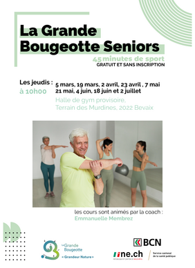 La Grande Bougeotte seniors propose des séances de sport adaptées, animées par Emmanuelle Membrez, axées sur le mouvement, la mobilité et le bien-être. Les exercices sont pensés pour respecter les capacités de chacun et permettre à toutes et tous de bouger à leur rythme, dans une ambiance bienveillante et conviviale. Ces moments favorisent l’entretien de la forme physique, l’autonomie et le lien social. Les séances ont lieu un jeudi par mois à 10h00, sont ouvertes à nos ainé.e.s, gratuites et sans inscription.