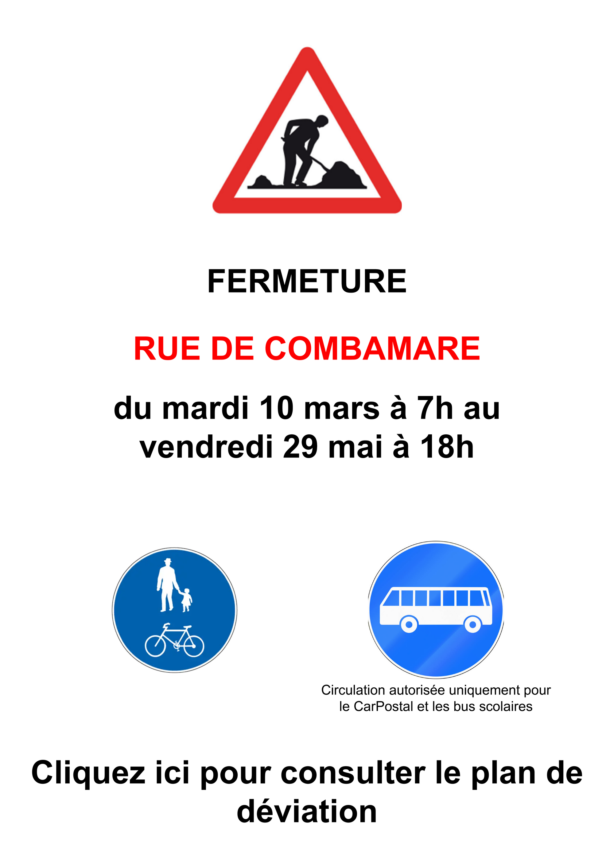 Il est rappelé que le périmètre du chantier est strictement interdit au public. Pour la sécurité de toutes et tous, il est formellement interdit d'y entrer. La Commune demande à la population de respecter ces prescriptions ainsi que les installations de chantier en place.